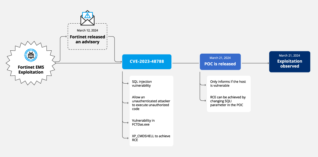 On March 12, 2024 Fortinet published an advisory about CVE-2023-48788, a SQL injection vulnerability in the FortiClient EMS security management solution. On March 21, researchers released a proof of concept (PoC) exploit for the vulnerability and since then there have been reports of exploits in the wild leading CISA to add the CVE to its list of Known Exploited Vulnerabilities (KEV) on March 25.