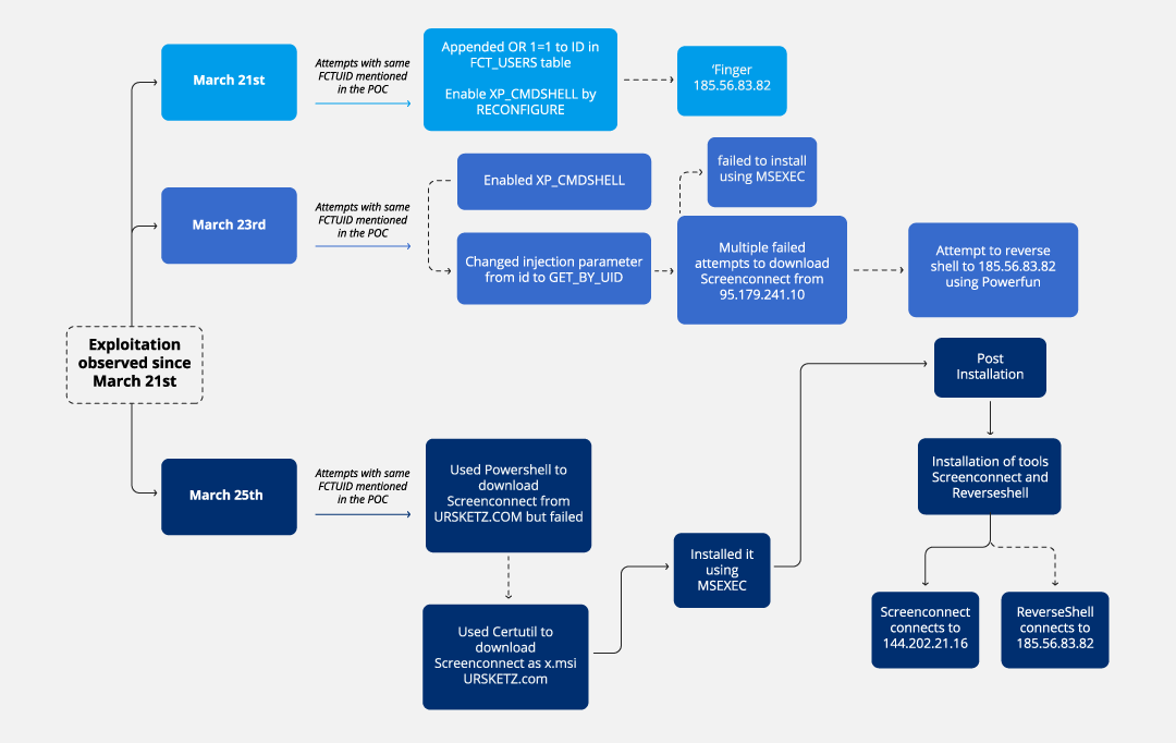 Since the PoC for CVE-2023-48788 was made available on March 21, we have observed exploitation attempts similar to the PoC. Here we discuss one specific incident that targeted a media company whose FortiClient EMS was vulnerable and exposed to the internet.