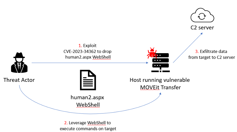 The figure below summarizes the incident that we have detected and analyze in the full report. First, the threat actor exploited CVE-2023-34362 on an Internet-facing host running a vulnerable version of MOVEit Transfer. Second, the attacker deployed a webshell named human2.aspx that allowed them to execute commands on the target. Third, the attacker leveraged the webshell to exfiltrate data to a C2 server.