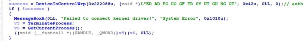 - Next, the executable sends a specific IOCTL 0x222088 to POORTRY. This IOCTL is a way to authenticate with POORTRY. In this case, it expects a hardcoded string “ED AD FG HG GF TR SY UT GH NG GT”. If POORTRY receives this string along with this IOCTL, it will execute other functionality when specific IOCTLs are sent from the userland executable. Otherwise, the IOCTL request will be ignored.