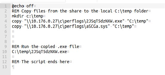 Both batch files (disableAV.bat) were used to copy 2JSqT5dzNXW.exe and aSCGa.sys from a local IP address (likely the first compromised machine) and to run the former file. Here are the contents of one of the batch files (the only difference between them is that one uses the “copy” command, while the other uses “xcopy”):