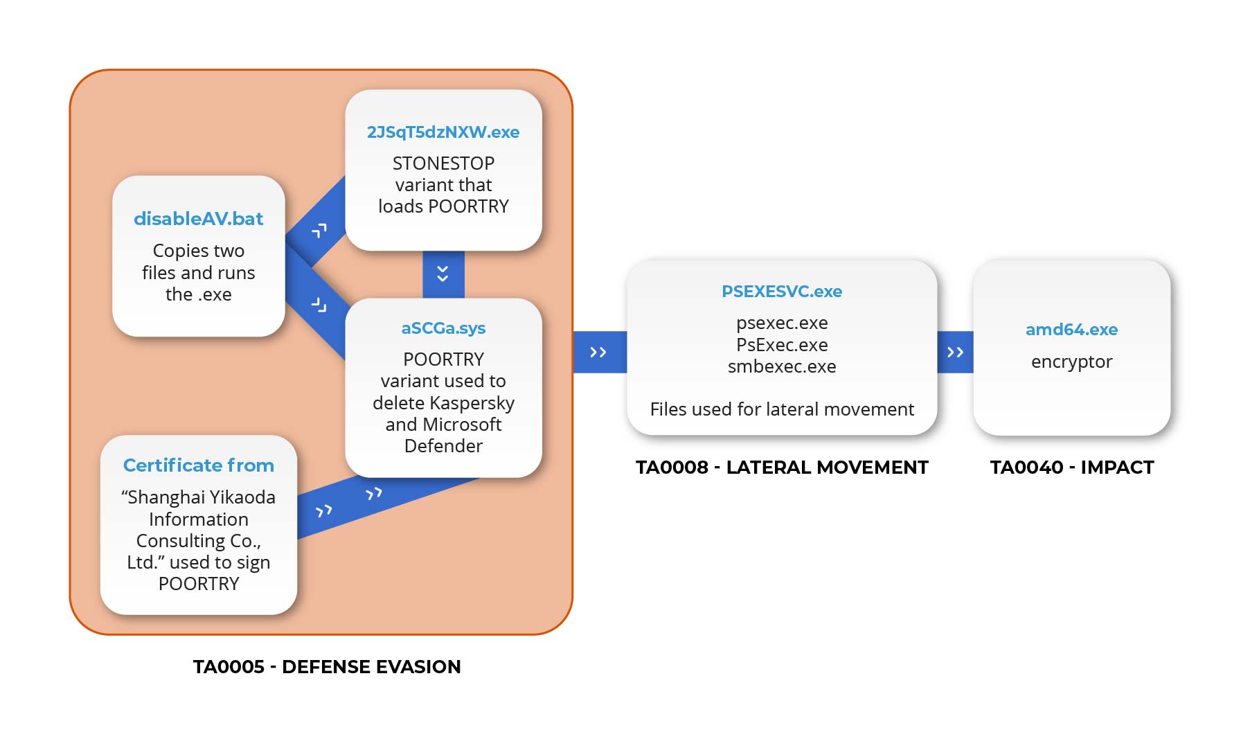 STONESTOP and POORTRY were used by the SCATTERED SPIDER cybercriminal group (tracked as UNC3944 by Mandiant) for stopping AV and EDR software. SCATTERED SPIDER is a group that has reportedly deployed the ALPHV ransomware in many cases in the past.