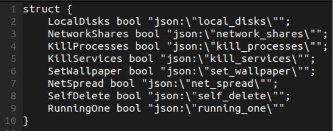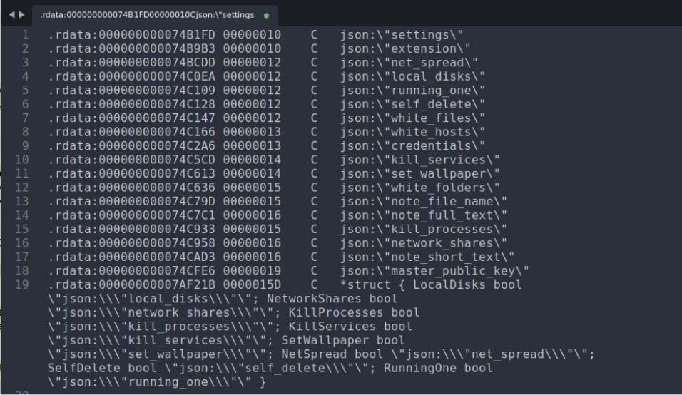 All these countermeasures make static analysis extremely difficult. The authors prevent dynamic analysis by protecting the encryptor config with a 32-byte passphrase. The cryptographic algorithm used by the authors appears to be ChaCha20-Poly1305. But we could not decrypt the config and analyze the sample further, since we did not have the required passphrase. Despite obfuscation, several interesting strings were present in the binary. For example, some parts of the JSON config: