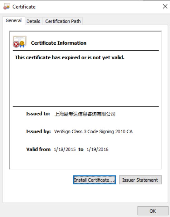 The driver is signed with a valid certificate from “Shanghai Yikaoda Information Consulting Co., Ltd.”, but it expired in 2016. It appears the attackers used a stolen certificate. We could not find any information about this company online, so it may be forged.