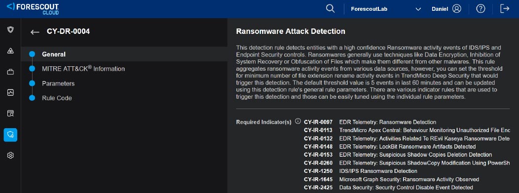 The figure below shows a description of the “Ransomware Attack Detection” detection rule which triggers when events occur, including when known ransomware artifacts are detected, when shadow copies are deleted or modified using PowerShell, or when files are encrypted.
