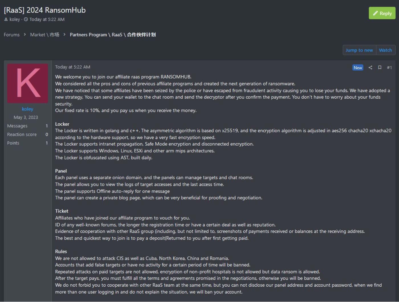 RansomHub was announced as a new ransomware-as-a-service (RaaS) affiliate program on the well-known RAMP cybercriminal forum on February 2 by “koley”. The forum message (shown in the figure below) had details on: