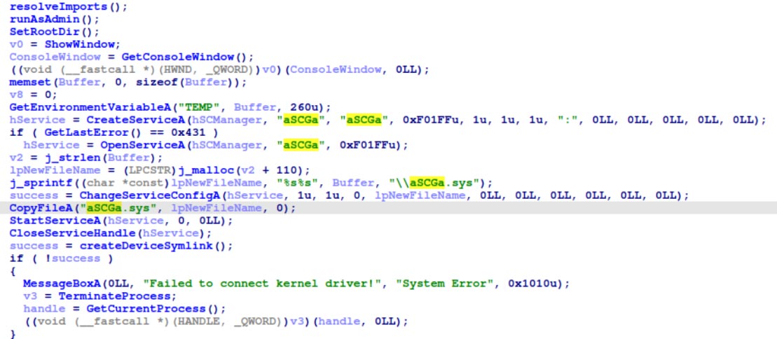 - It creates a copy of the POORTRY sample (aSCGa.sys) in the TEMP folder of a current user and loads it as a service. Note that it requires ADMIN privileges to do that which suggests that this is done after the local ADMIN account is compromised. The sample contains no privilege escalation exploits.