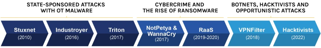 The figure below summarizes a timeline of relevant attacks or events in the past 15 years and how they represent changes in the CI cybersecurity landscape, which we discuss below.