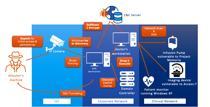 While novel, the R4IoT threat applies to almost every industry and organization nowadays. However, we chose a hospital for our attack scenario because of the diversity of IT, OT, IoT and Internet of Medical Things (IoMT) devices that healthcare delivery organization (HDO) bioengineers and SOC teams must manage. In this blog post, we explore why healthcare organizations would be a perfect target for an R4IoT-like attack, what that attack might look like and, most importantly, what you can do to avoid becoming a victim.