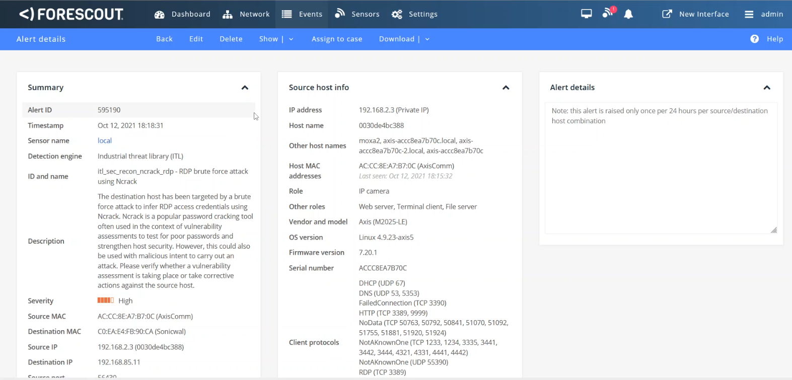 Figure 4 – An eyeInspect alert for the RDP bruteforcing attack from the IP camera to the NVR workstation