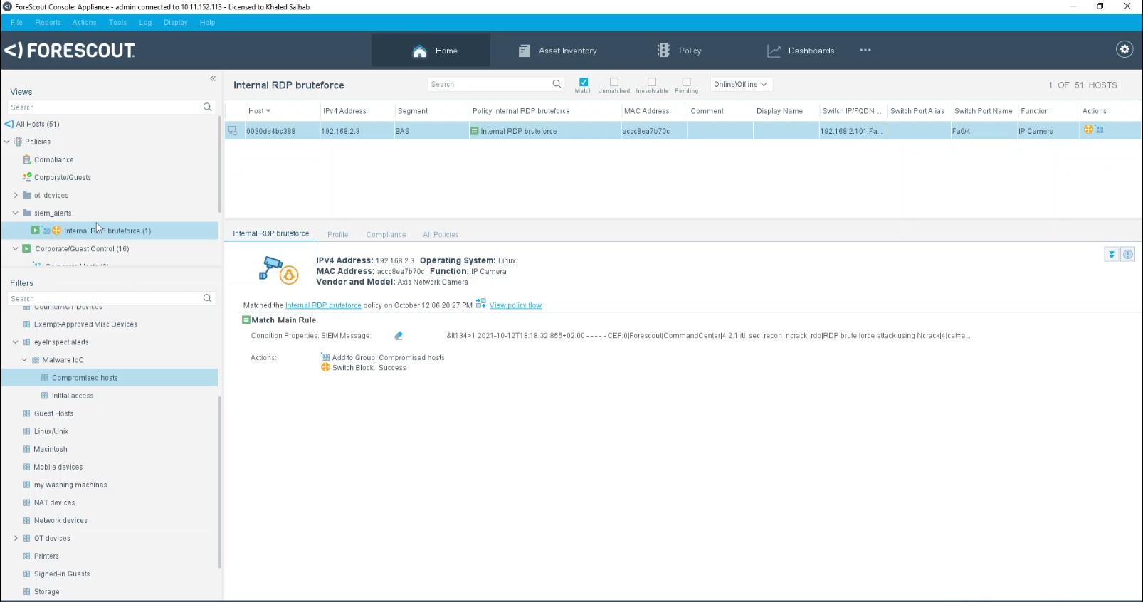 Figure 5 – An eyeSight policy to block the IP camera on the network switch once the malicious RDP brute forcing is detected