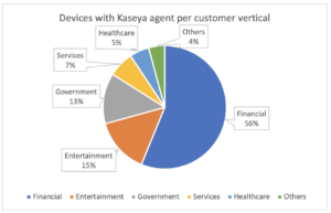 We see 116 customers on Device Cloud with Kaseya installed on their devices (close to 7% of the total 1,688 customers uploading data to Device Cloud). On these customers, we see close to 30,000 devices with the agent and 9 with the server, divided by industry verticals as shown below.