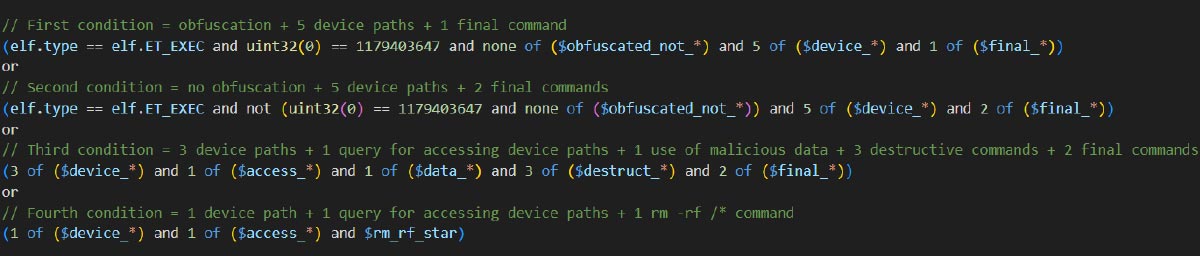 To identify new IoT malware with wiping capabilities, we developed a YARA rule that captures the known wiping behavior from the samples above. These behaviors include deleting data, writing junk data on specific device paths, and rebooting devices. The figure below summarizes the conditions included in that rule.