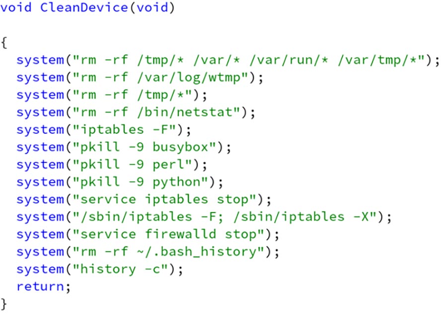 - CLEAN – Calls the CleanDevice() function, shown below, to remove logs and temporary files, and flush and stop iptables and firewalld. This function seems to be a slightly modified version of the RemoveTMP() function from yet another Mirai botnet variant.