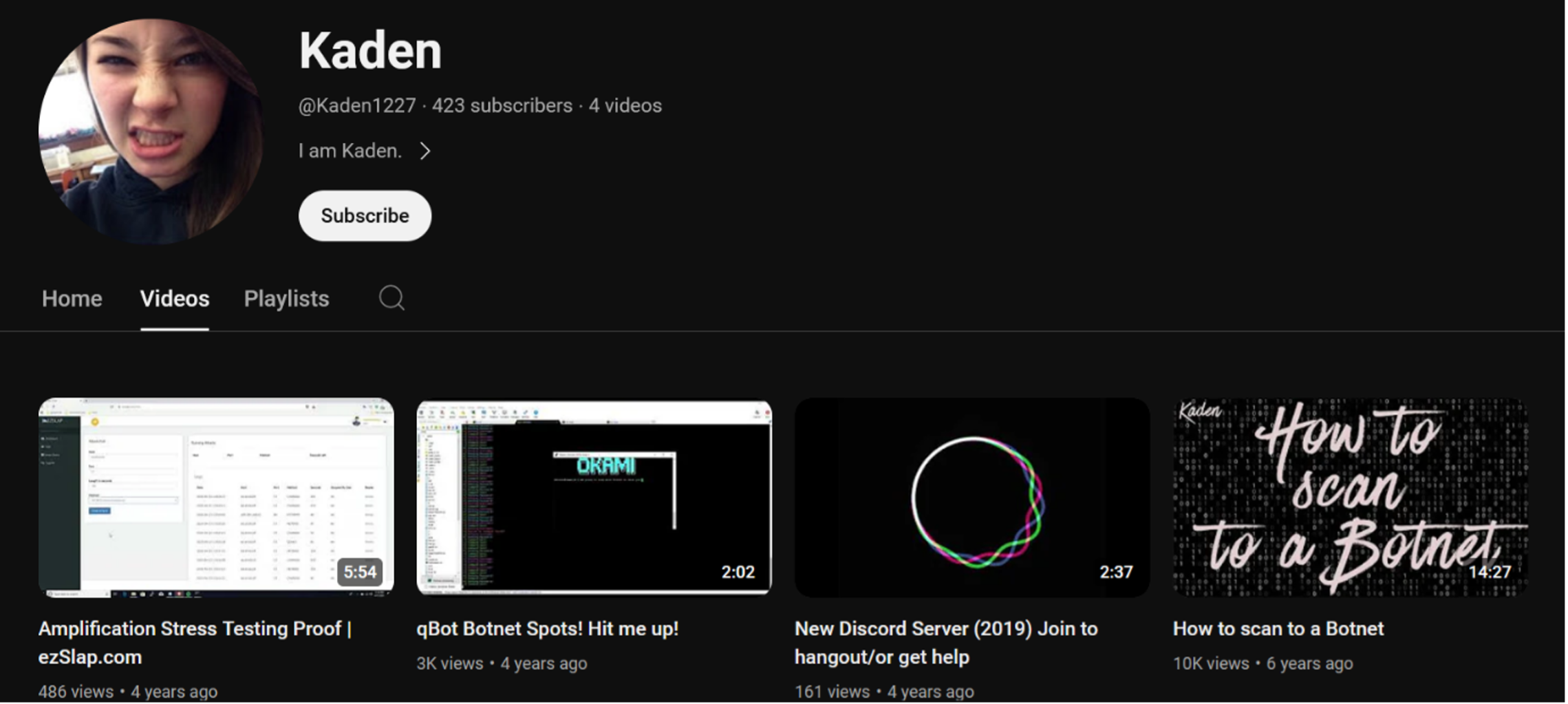 On YouTube, we found a profile named ‘@Kaden1227’ that uploaded four videos between 2018 and 2020, all related to botnets or similar activities, as shown below.