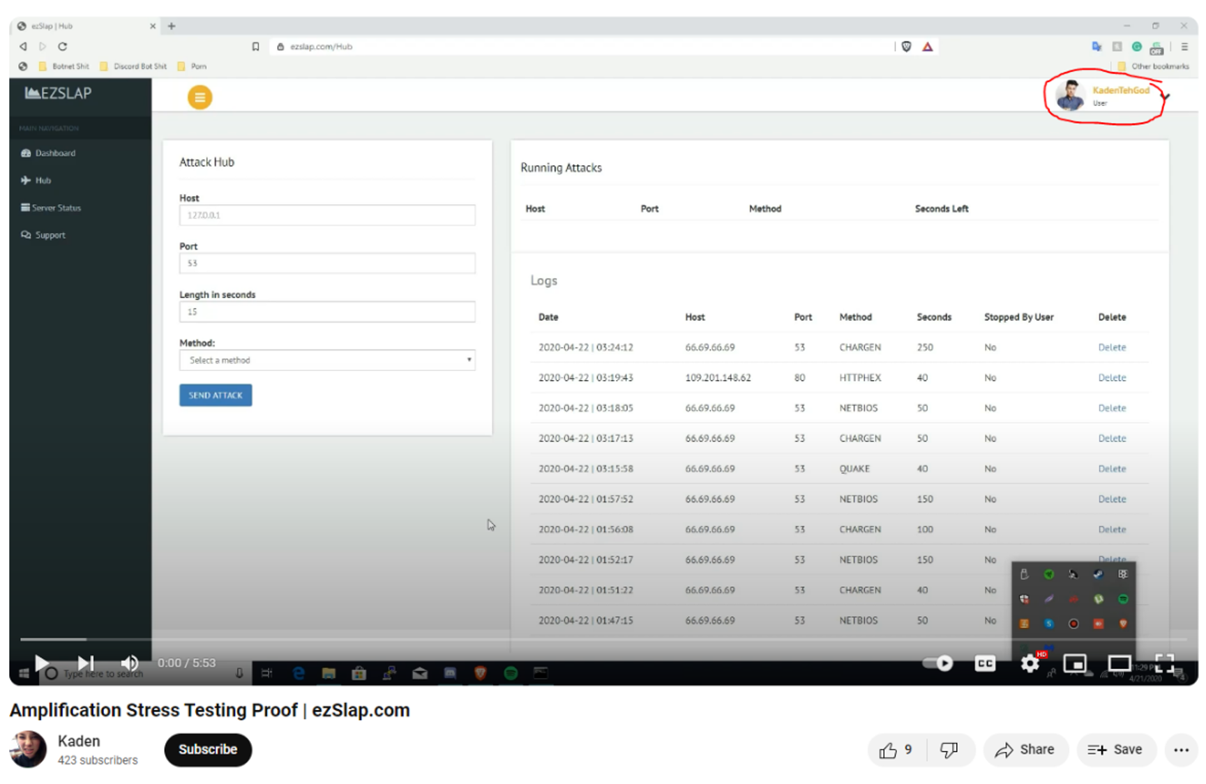 The most recent two videos advertised ‘spots’ (compromised devices) on the Okami botnet and a stresser service called ezslap[.]com facilitates launching DDoS attacks. On the video about the stresser service, the username ‘KadenTehGod’ is also visible.