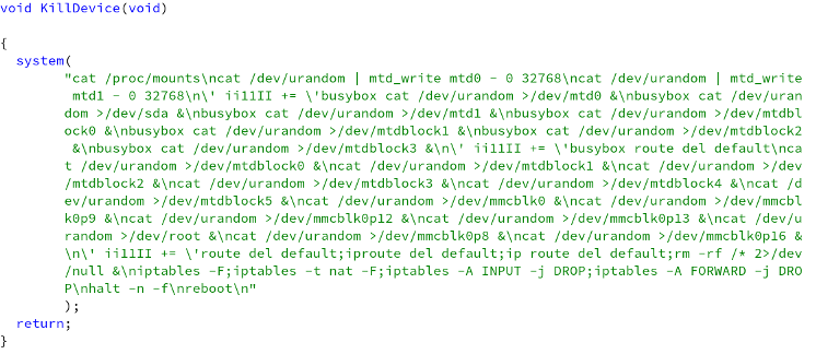 The wiping functionality is found in a function called KillDevice() which appears to be directly sourced from Silex since it uses the same “ii11II” variable name. However, this function is not currently called by any C2 command indicating that the botnet is still under development.